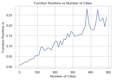In essence, as the number of cities increases, the computation time for this algorithm will grow linearly. This can be observed in the approximately linear scaling in the following graph.