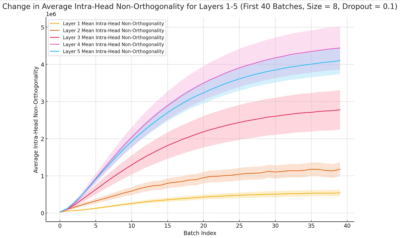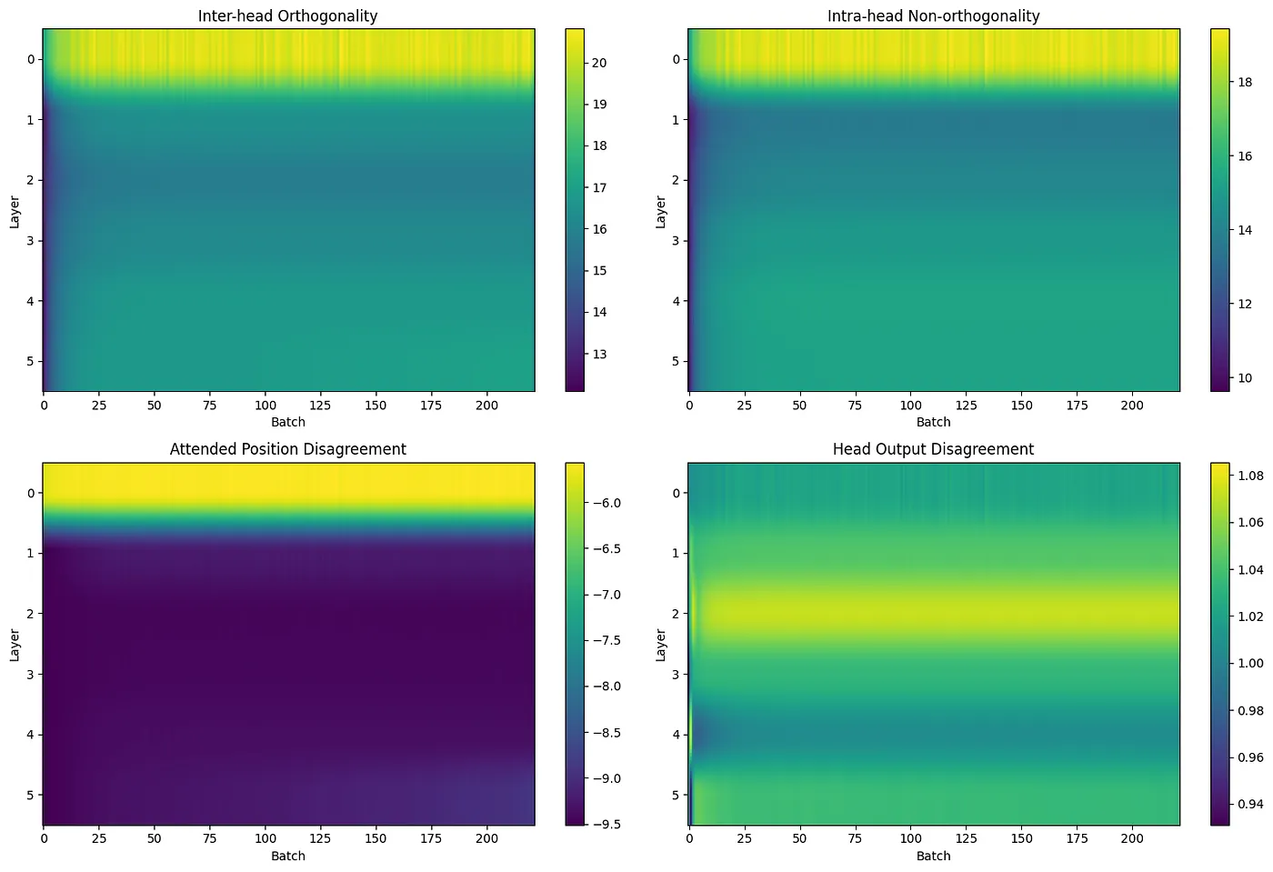 Although batch loss and head diversity are closely correlated in the initial epochs, it’s better to view them as separate outcomes of the learning process for attention weights rather than attributing higher batch loss directly to increased head diversity. For the first 40 batches in layer 0, the head output disagreement means, and variance yields an R² of around 90%, demonstrating high predictive power, although this decreases in the later layers.