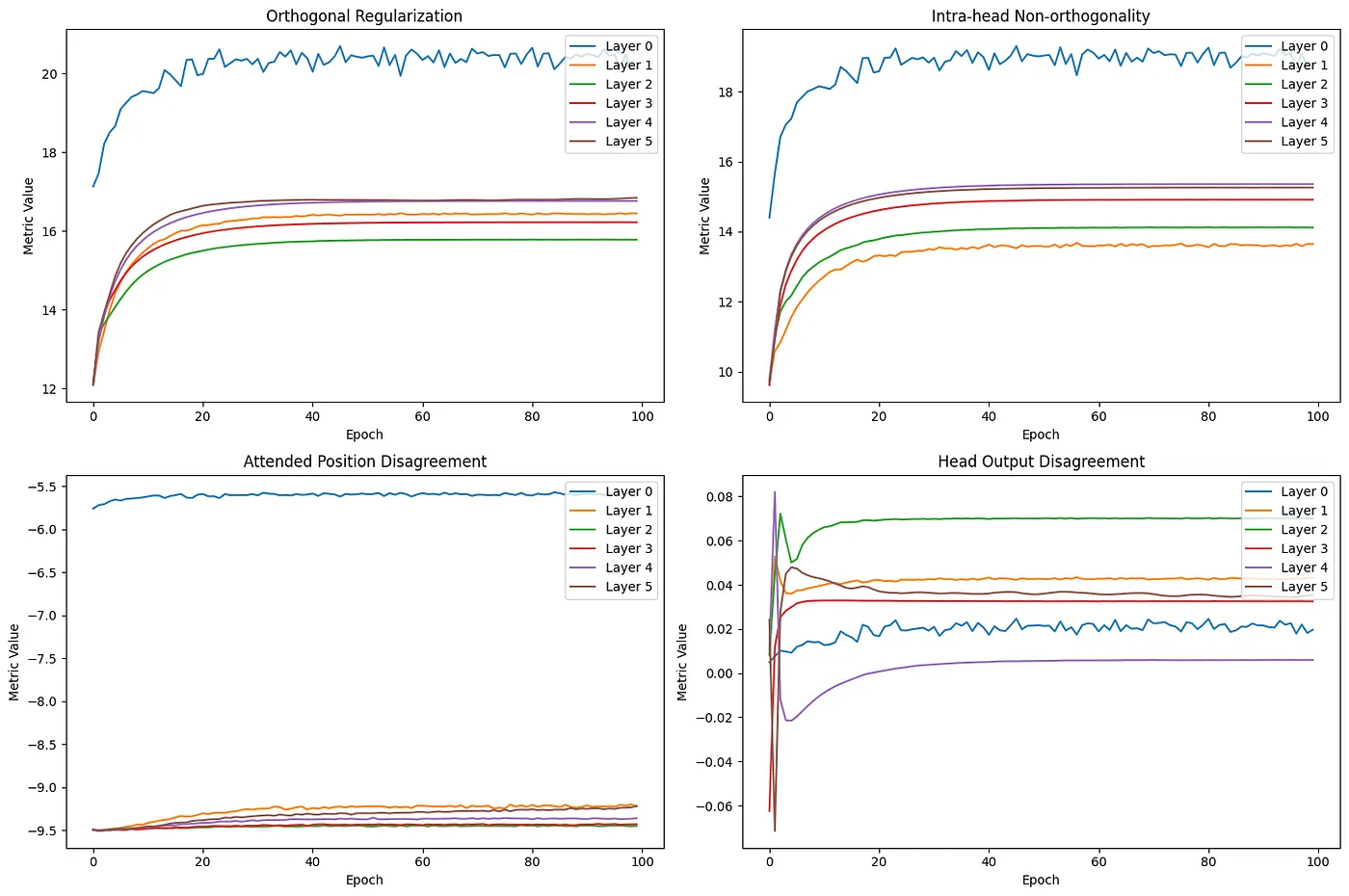 We will use four metrics to measure the diversity of heads in our modified MultiHeadAttention module: inter-head orthogonality, inter-head context vector non-orthogonality, inter-head output dissimilarity, and intra-head attention diversity.
