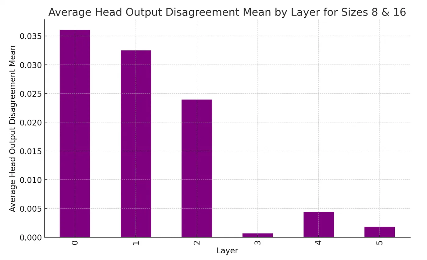 There is a notable contrast in the level of disagreement among the outputs from different heads across the layers, as illustrated below. The initial three layers generate distinctly different outputs, whereas the representations in subsequent layers become increasingly similar. Voita et al. further demonstrate that most of the mutual information concerning the predicted token accumulates in the earlier layers (as shown in Figure 2 of the paper), with the later layers contributing only minor modifications to the target representation.